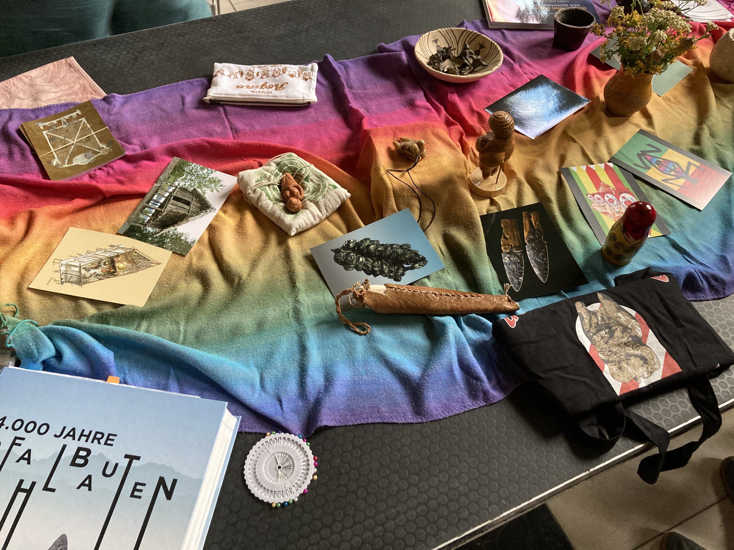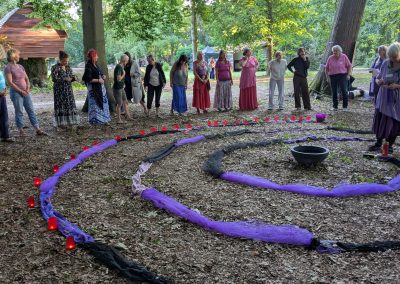 After the workshops, there’s time to explore the park in the fresh air. There, you can discover a peacock mother with five young, or the tapestries depicting Astrid Walser’s eight seasons at the women’s tent. Goddess banners by the American artist Lydia Ruyle decorate the Amazon Hall here and there. At 5 p.m., people from the same regions meet in 13 groups for a discussion. Later, dedicated women create a spiral of lament in light of the wars in the world. Three concerts by Schwessi, Luisa Laakmann, and Laura Lee & the Jettes conclude the rich day.