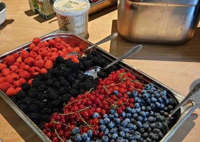 It’s almost time for dinner. Preparing meals using local organic produce is an important part of the festival; everyone takes on various tasks in the kitchen for two hours, sharing a meaningful and enjoyable time together. Har Sternenherz and his culinary team aim to engage people with all their senses in how it’s possible to enjoy tasty, healthy, and delicious plant-based foods. Dinner is served at round tables inside or outside under the umbrellas.
